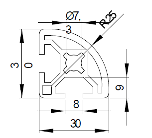 Profilé alu quart de rond avec 2 rainures de 8mm 30x30Rr